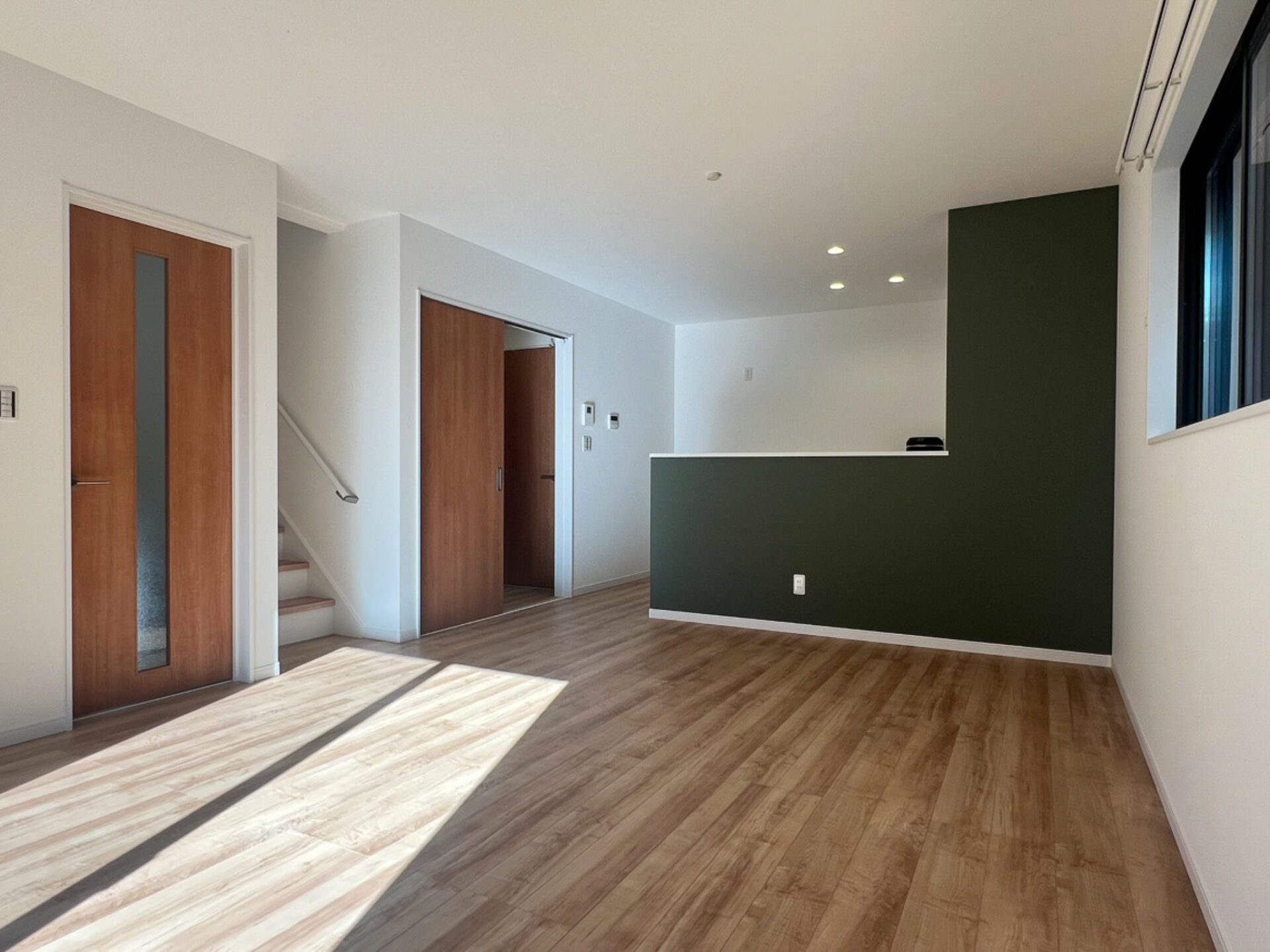 温かみのある無垢フローリングに、落ち着いたグリーンのアクセントウォールが映える開放的なリビング・ダイニング空間。 木製建具が温もりを添え、自然光が優しく差し込む心地よい住まいです。階段との一体感が空間に広がりをもたらします。